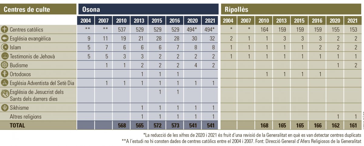 Malgrat que Osona és la comarca amb més centres catòlics, en el global de totes les confessions les xifres la situen en el segon lloc, per darrere del Barcelonès, amb 715, davant dels 541 d’Osona. Segons el mapa, la tendència s’ha estabilitat a Osona i el Ripollès i també a la resta de Catalunya. Des de la Direcció d’Afers Religiosos, que depèn de la Conselleria de Justícia, detallen que sobretot pel que fa altres confessions, algunes van créixer molt vinculades a onades migratòries, sobretot entre els anys 90 i el 2010, i ara es mantenen en el temps. Per exemple, en el cas de l’Església evangèlica, des del 2004 s’han més que triplicat, són les que més han augmentat, passant de 9 a 32 a Osona. En els centres on es practica l’islam, s’ha passat de 5 el 2004 a 8 el 2020 i 2021 en el cas d’Osona i al Ripollès d’1 a 2. En tots dos casos vinculat a l’arribada de persones d’altres països on es practiquen aquestes religions. En el cas del budisme, del 2020 al 2021 s’han reduït a la meitat els temples, de 4 a 2 a Osona –ara n’hi ha un a Vic i un a Tavertet–, mentre que al Ripollès se n’ha obert un a Vallfogona i ja n’hi havia un altre a Camprodon.