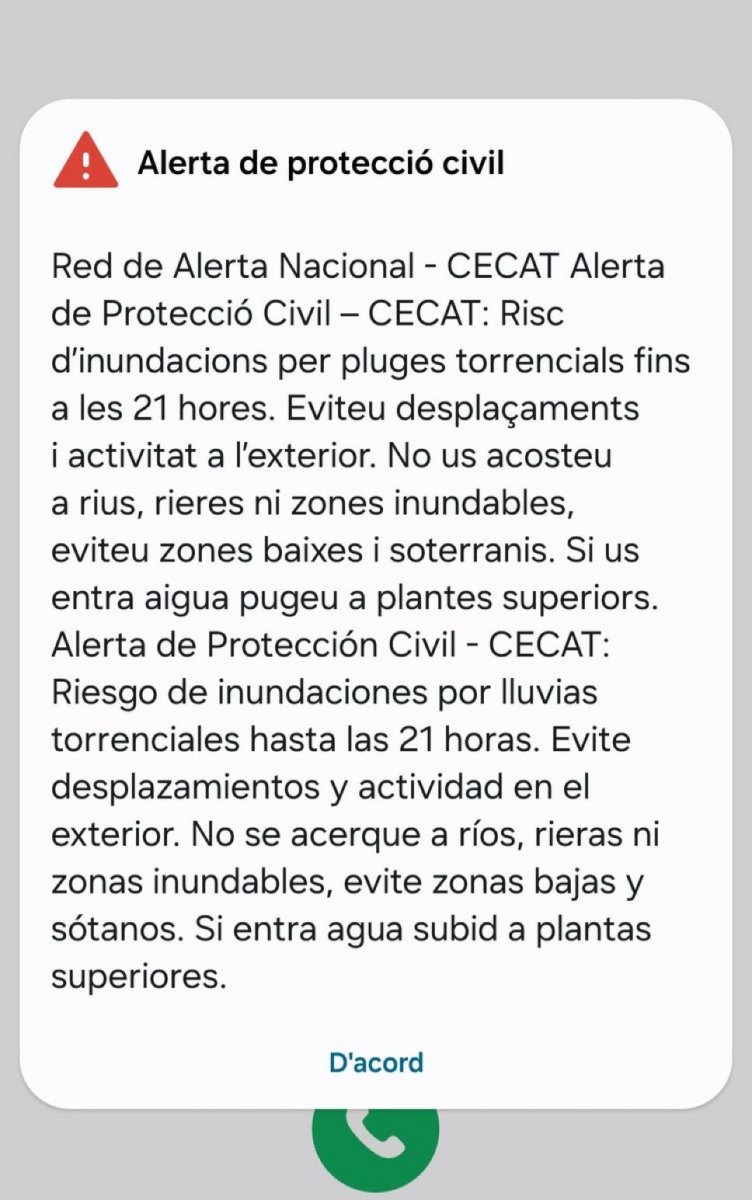 Protecció Civil ha enviat el missatge d’alerta als mòbils dels veïns d’Osona, el Lluçanès i el Ripollès (a les 14.30h) pel risc d’inundacions per pluges torrencials fins a les 21.00 hores. Segons el Meteocat, la situació és de perill molt alt (6 sobre 6) per intensitat de pluja a pràcticament tot Catalunya.