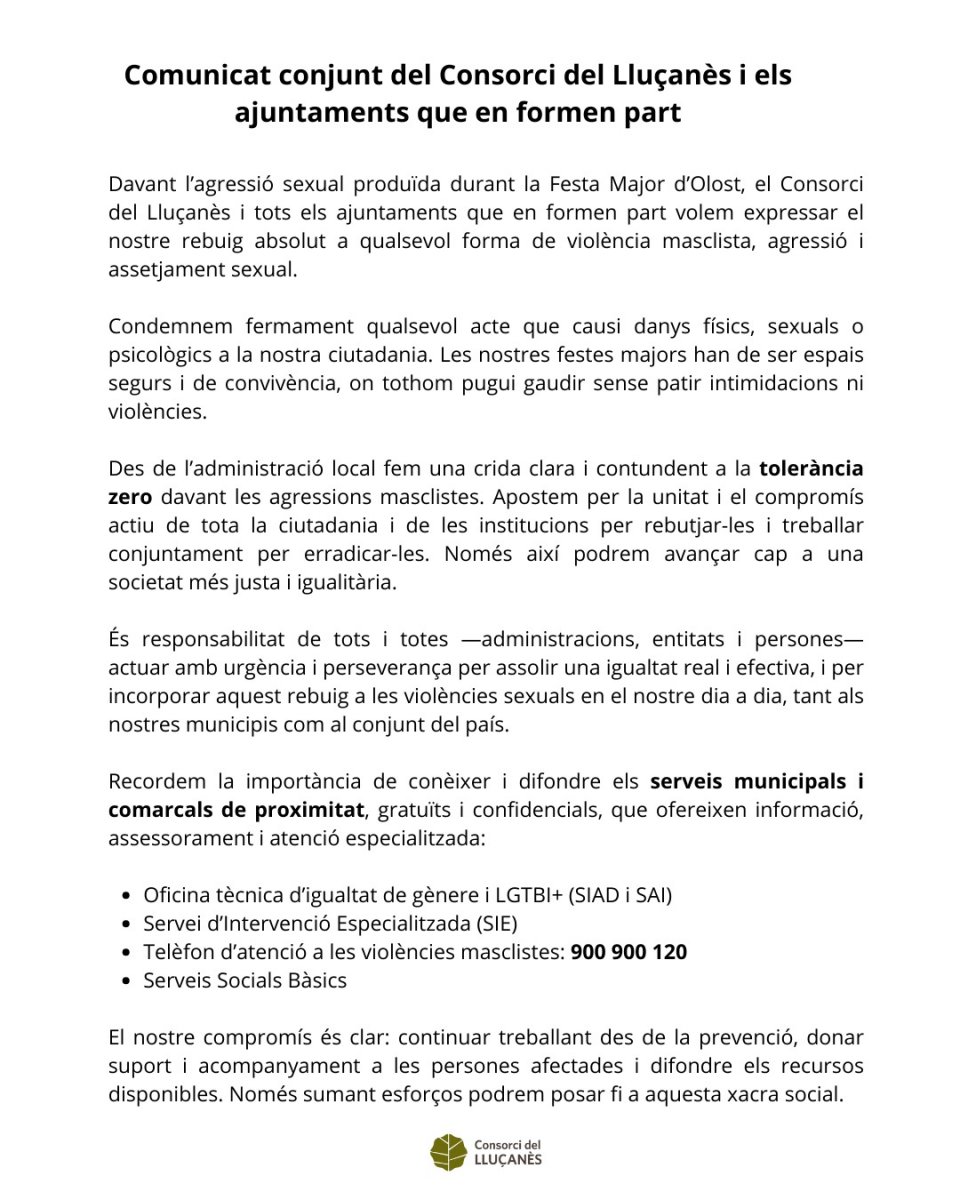 L’alcalde ha remarcat que el municipi ha treballat de manera coordinada amb el Consorci del Lluçanès i amb els tècnics d’igualtat. Frut d’aquesta col·laboració, els ajuntaments del Lluçanès han fet un comunicat conjunt condemnant els fets i reivindicant la necessitat d’erradicar qualsevol tipus de violència sexual.