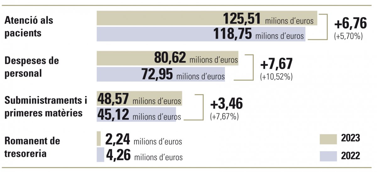 En tots tres casos les partides van augmentar respecte al 2022, fins a un 10% pel que fa a les despeses de personal o un 8% en aprovisionaments. Circumstàncies que sumades a altres factors, com haver deixat de rebre ingressos extraordinaris vinculats a l’atenció de la covid, es materialitzen en un compte de resultats en negatiu i trencador respecte a exercicis anteriors, ja que el del 2022 s’havia tancat, per exemple, amb un positiu de 481.220 euros.