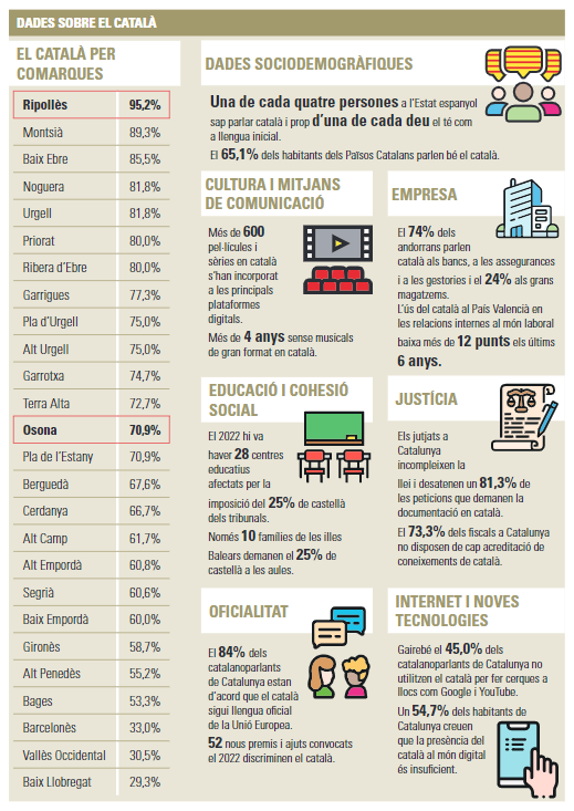 Pel que fa a la comarca d’Osona, el percentatge de ciutadans que s’identifiquen amb el català és del 70,9%, un 28,8 punts per sobre de la mitjana nacional. A Osona una de les claus perquè el català continuï sent la llengua predominant és la feina que es fa des del Centre de Normalització Lingüística (CNL), conjuntament amb l’equip de treball del Voluntariat per la Llengua, que s’encarreguen de difondre i promoure la llengua catalana a persones, la majoria provinents de països estrangers, i facilitar el seu procés d’adaptació a Catalunya.