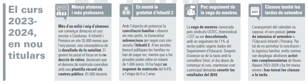 Anna Simó (ERC), la consellera d’Educació, ha destacat al llarg de la setmana que el descens de matrícula a Infantil i Primària coincideix amb un increment del personal docent fruit dels 3.500 contractes del gener i els gairebé 1.200 d’aquest setembre.