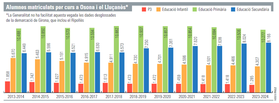 L’anàlisi de la Primària (10.277 alumnes a Osona i el Lluçanès) fa també palès com es van buidant les aules i va sumint en el record l’època en què calia recórrer a barracons, mentre que les xifres d’ESO pugen per pura lògica: els alumnes que hi ha ara als instituts són els que el 2013, el 2014 o el 2015 omplien les llars d’infants i el parvulari.