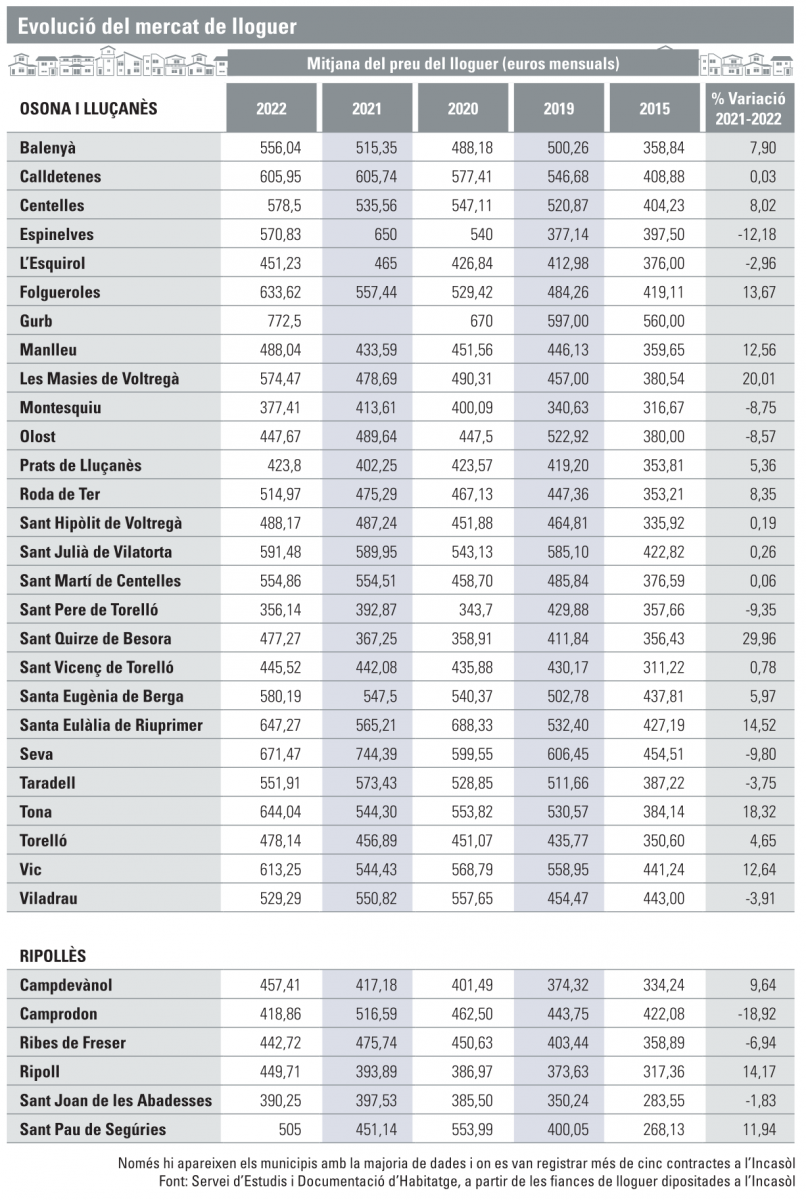 Pel que fa al preu mitjà del lloguer a Osona i el Lluçanès, ronda els 552 euros al mes, xifra que representa gairebé un 8% més que l’any passat. A les poblacions on més ha augmentat el preu en comparació amb el 2022 i el 2021 són Sant Quirze de Besora (29,96%), les Masies de Voltregà (20,01%) i Tona (18,32%). Per contra, on més ha baixat és a Espinelves (-12,18%), Seva (-9,80%) i Sant Pere de Torelló (-9,35%).