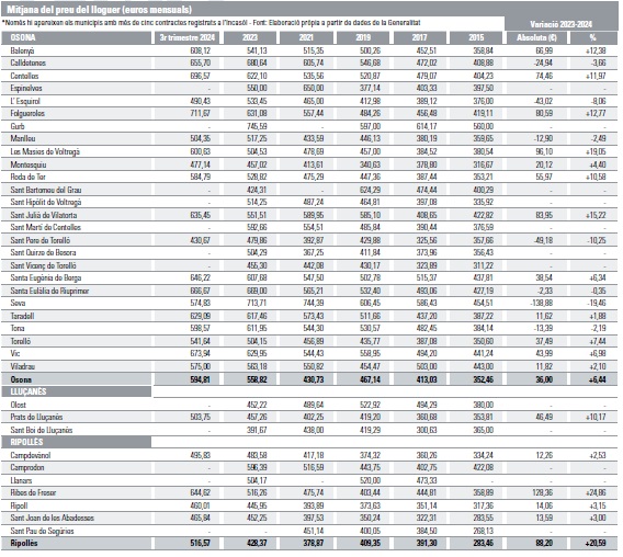 A l’altre plat de la balança hi consten, com a municipis amb els lloguers més baixos, Sant Pere de Torelló (431 euros), Montesquiu (477) i l’Esquirol (490).