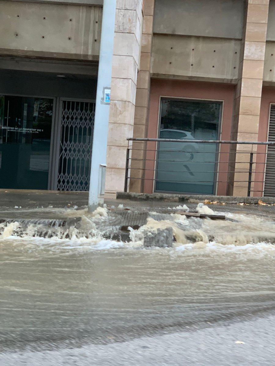 La forta pressió de l’aigua ha provocat desperfectes a la vorera, a davant del registre de la propietat 1, de la plaça del Mil·lenari de Vic.