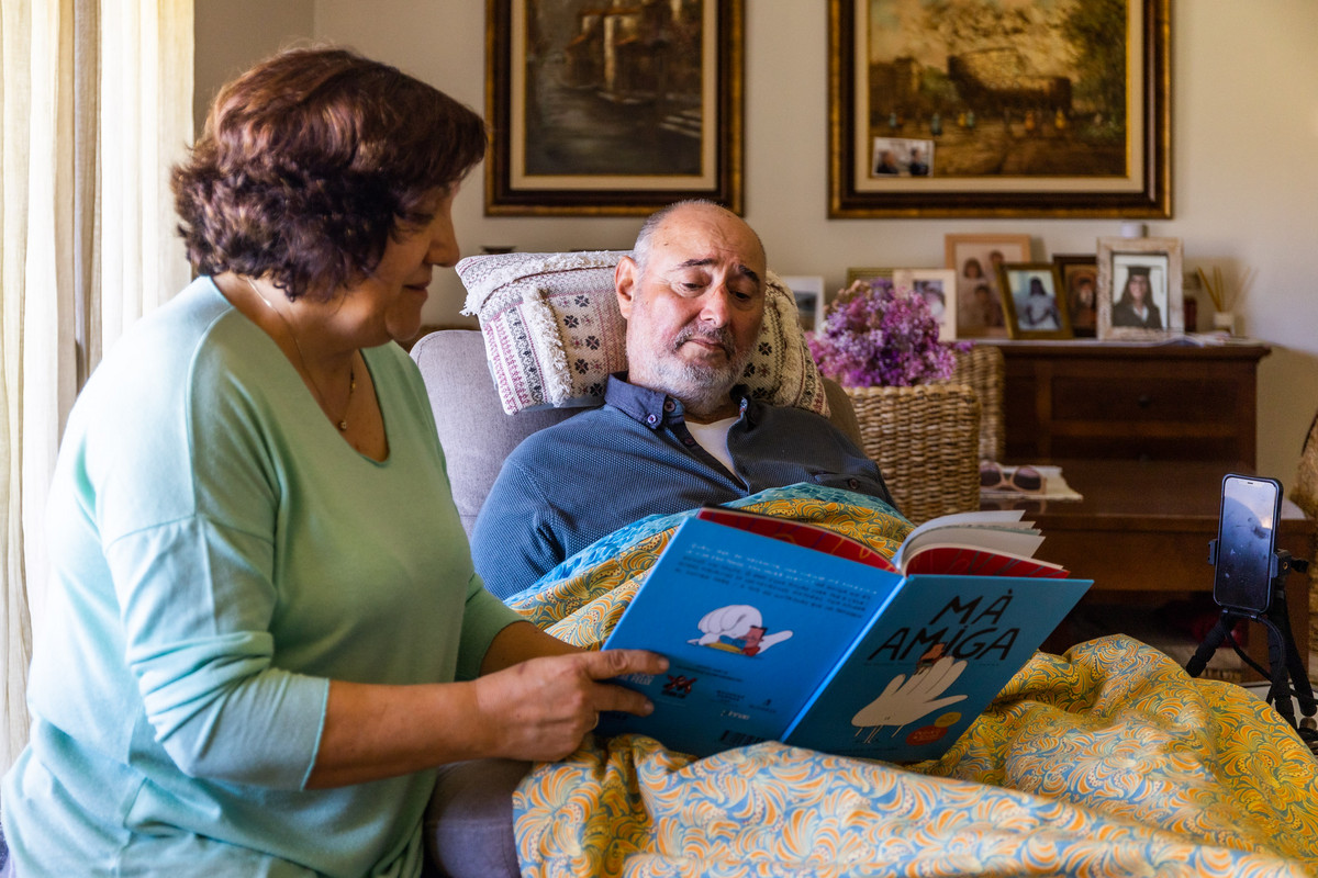 Severí Gallach i la seva dona, Anna Palma, aquest dimarts a casa seva, a Sant Vicenç de Torelló, llegint un llibre que ha escrit una persona afectada per l’ELA |