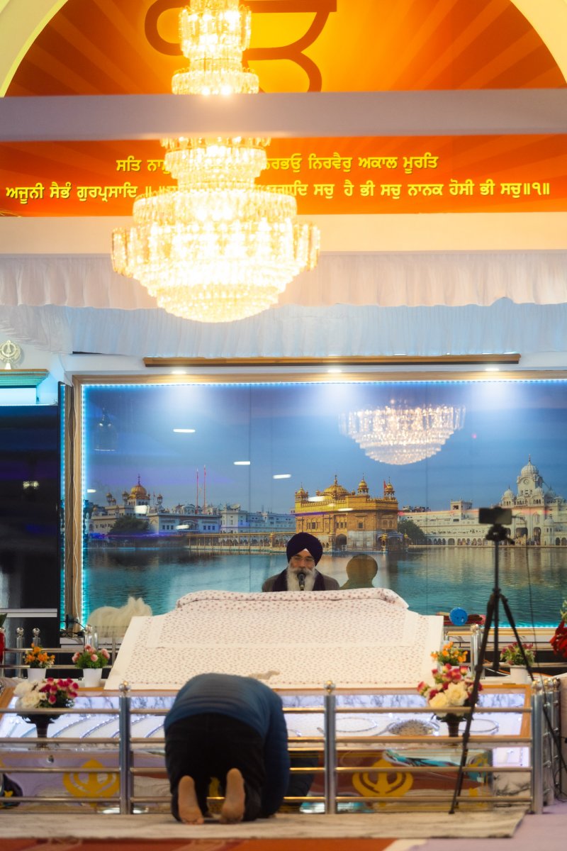 En arribar, cal treure’s les sabates i els mitjons, rentar-se les mans i els peus, i cobrir-se el cap. Tot seguit s’entra a la sala principal que conté les escriptures sikhs, on cal prostrar-se i, si es considera oportú, deixar una ofrena econòmica. Finalment, se seu i s’escolta la recitació.