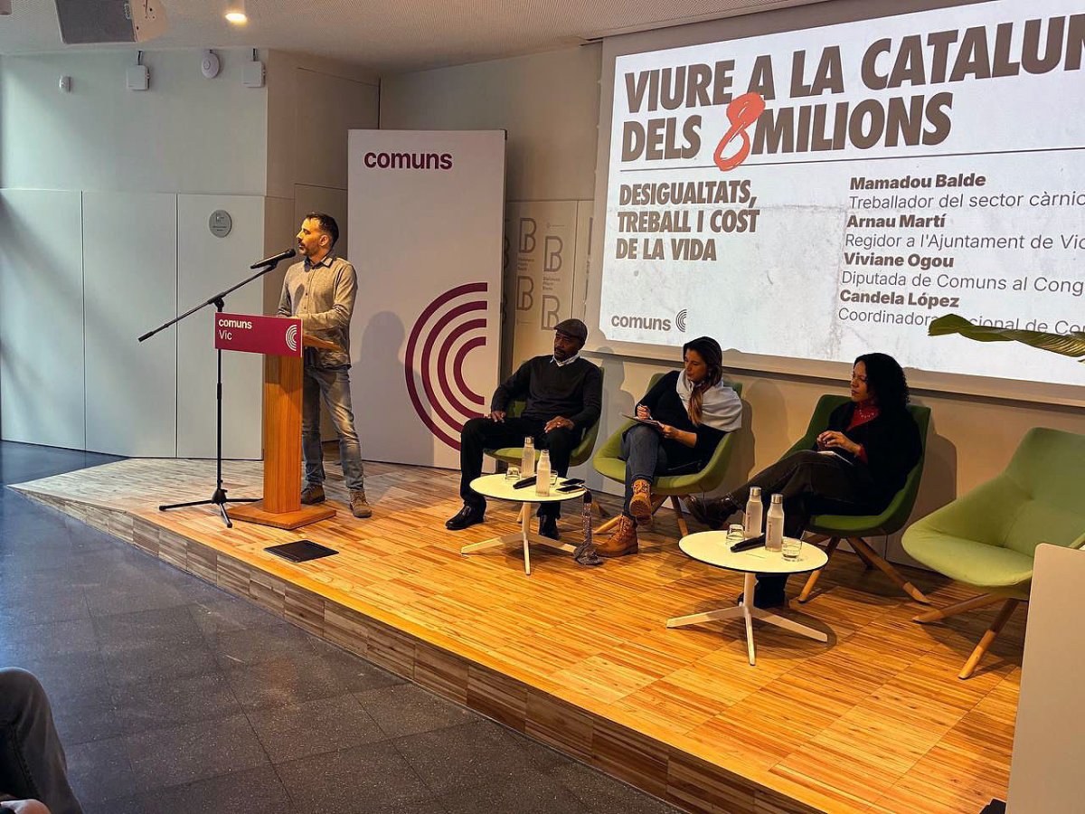 Al debat hi van participar un treballador del sector carni, Mamadou Balde; el regidor de l’Ajuntament de Vic Arnau Martí; la diputada del Congrés dels Diputats Viviana Ogou, i la coordinadora nacional de la formació, Candela López.
