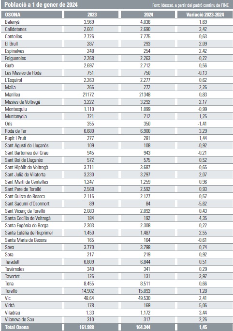 En relació amb les mateixes estadístiques publicades per l’Idescat, a Osona, les dades de l’últim any certifiquen un ascens destacable. Com que són del 2024, no inclouen encara el fet d’haver superat la barrera dels 50.000 habitants a Vic, però sí increments significatius a Manlleu, Torelló o Roda de Ter. De fet, tenint en compte el conjunt de la comarca, la xifra total de ciutadans –164.344– supera dades de l’any 2021, quan el Lluçanès encara formava part d’Osona.