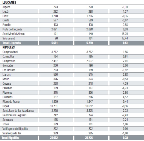En aquest sentit, la variació dels últims anys és positiva a dues de les tres capitals de comarca –Vic i Prats de Lluçanès–, però negativa a Ripoll, que ha passat de 10.731 veïns i veïnes a 10.692.