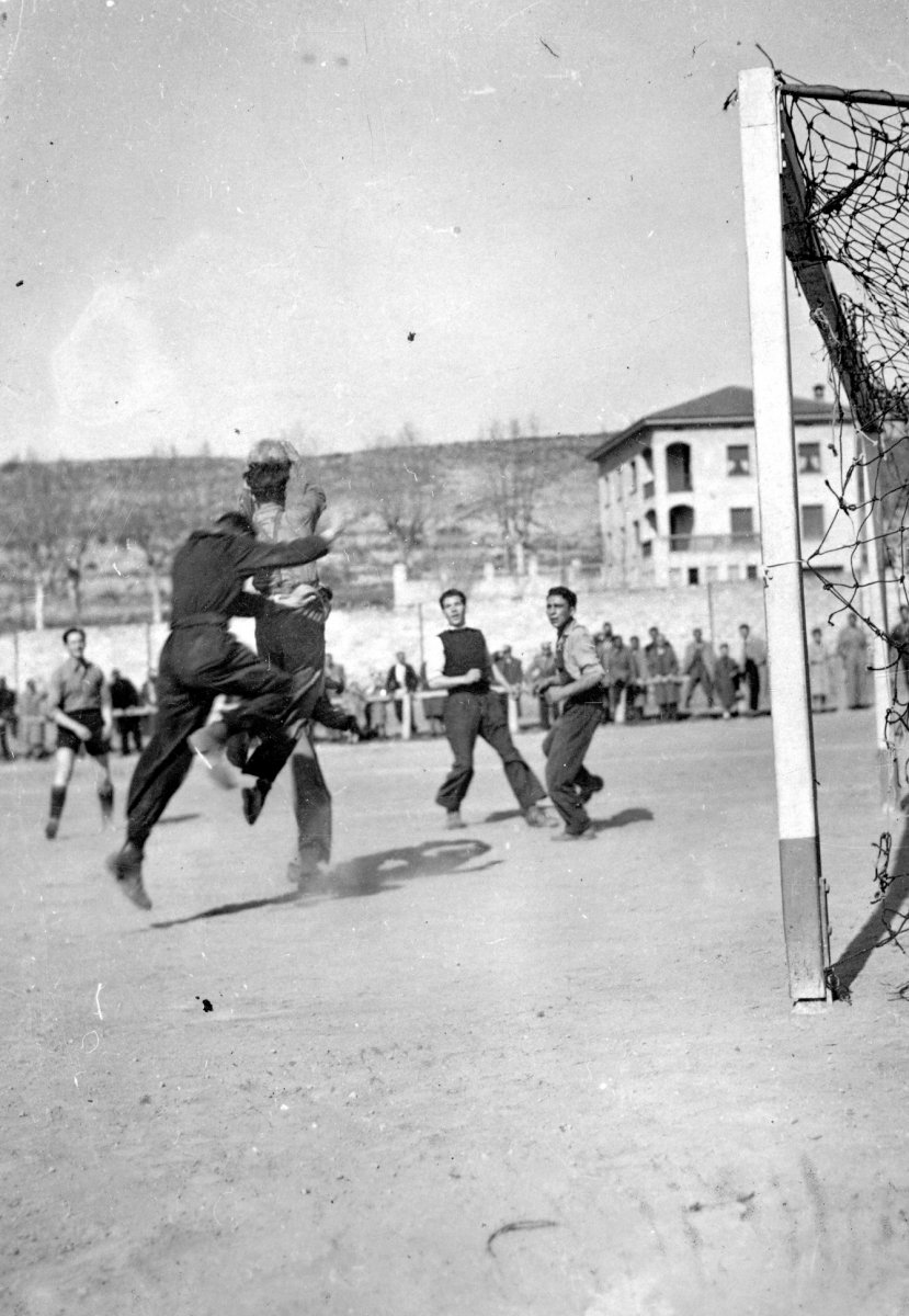 Una de les denominacions que s’ha donat a un dels parcs de Torelló ha estat el del Palco del Sastre, situat proper al pont de Malianta i al punt on hi havia hagut el primer camp de futbol del poble. Segons l’historiador Gerard Verdaguer, aquest era el nom popular que es va donar a una zona fora del camp on anava la gent a veure els partits. Entrar al camp “era de pagament”, explica, i hi havia qui no volia o no podia permetre’s pagar. Per això, molts anaven a una “zona alçada al costat de la via” del tren, a Cal Sastre, i des d’allà veien els partits de franc. A la foto, un partit de futbol al camp de Malianta, probablement entre les dècades de 1940 i 1950.