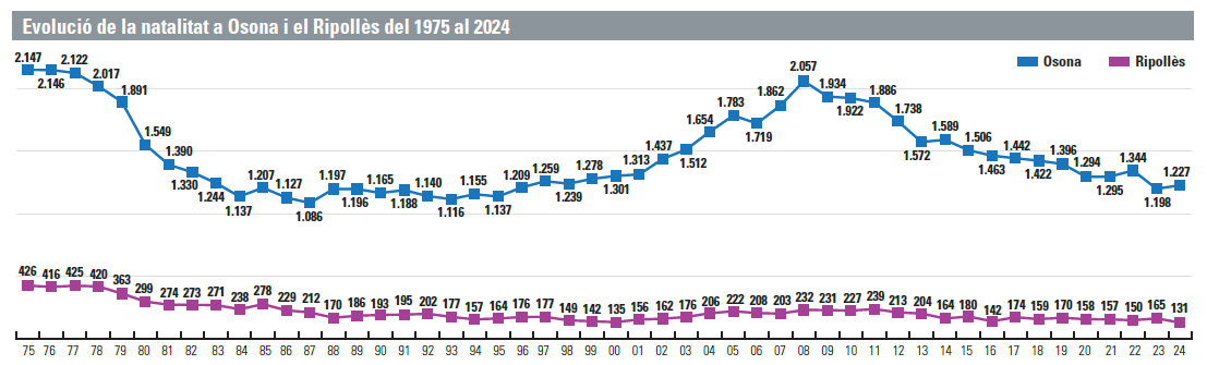 Aquesta realitat de la davallada de la natalitat és especialment acusada a comarques com el Ripollès, on l’any passat van néixer 131 nadons, 34 menys que el 2023 (vegeu la gràfica de la part superior), però també hi ha casos de lleuger creixement com passa a Osona, on van néixer 1.227 nounats, 29 més que l’any anterior.
