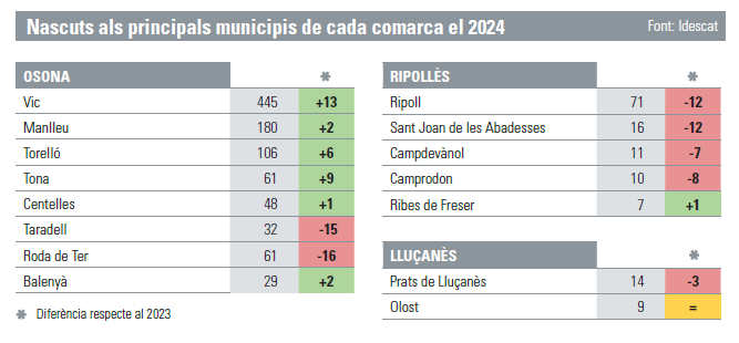 Al Lluçanès la taxa és de 6,12 per cada 1.000, amb 35 naixements, els mateixos que el 2023, i la mitjana catalana se situa al 6,7 per 1.000, inferior a la del 2023 (6,8).