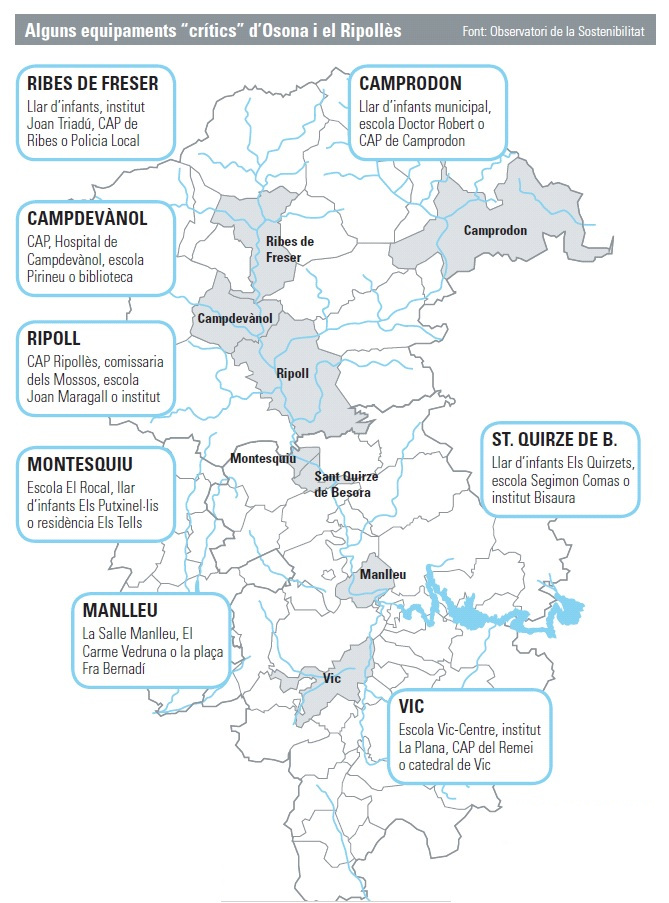 Mirant amb detall el mapa de l’OS, els municipis d’aquestes dues comarques amb instal·lacions “crítiques” són una desena: Ripoll, Camprodon, Campdevànol, Ribes de Freser, Vic, Manlleu, Roda de Ter, Gurb, Sant Quirze de Besora i Montesquiu.