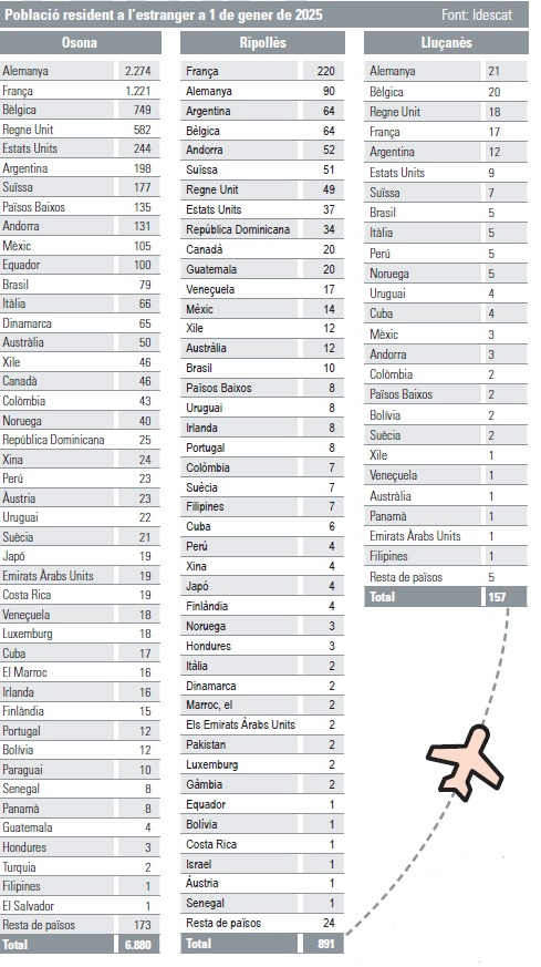 Agrupant nascuts i no nascuts a Catalunya, des del 2009, la població d’Osona, el Ripollès i el Lluçanès que viu a fora s’ha multiplicat per cinc. Fa 16 anys enrere, entre totes tres comarques hi havia 1.571 persones registrades al padró de residents a l’estranger. Actualment, aquesta xifra ha augmentat als 7.928 habitants, dels quals 6.880 són osonencs, 891 ripollesos i 157 lluçanencs.