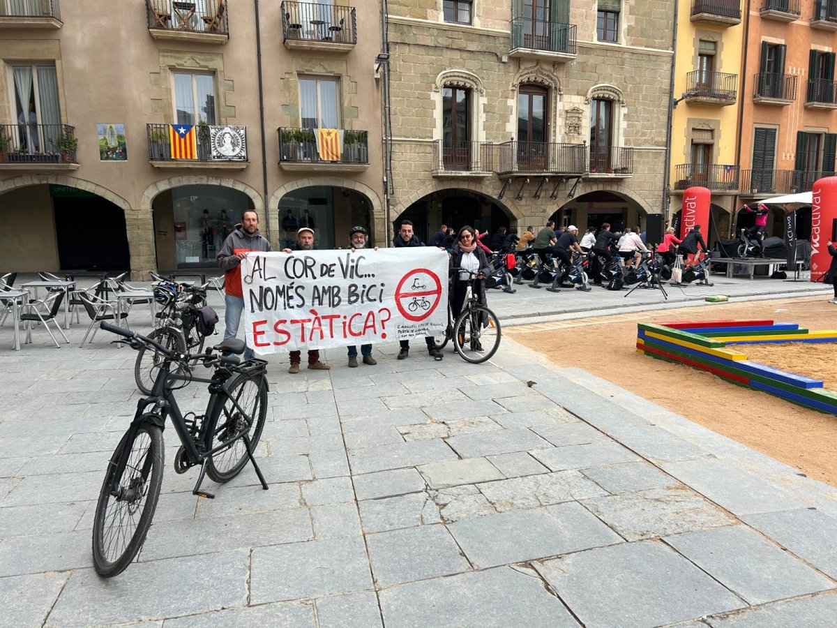 La plaça Major de Vic acull aquest dimecres al matí la sessió d’spinning “Pedala al cor de Vic!” organitzada pel mateix Ajuntament, pels actes previs al pas del Tour de França. Ha estat en aquest marc en què Osona amb Bici ha protestat per les prohibicions d’anar amb bici a alguns carrers de la ciutat.