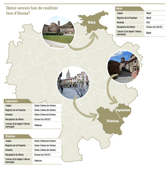 On ho tenen més complicat és a Vidrà, on la dispersió de serveis és més notòria: més enllà dels que poden trobar a Vic (l’atenció hospitalària, per exemple), el partit judicial assignat al municipi és el de Ripoll, mentre que si han de fer alguna gestió presencial a Hisenda, s’han de desplaçar fins a Olot, a una hora de camí, ja que a Ripoll no hi ha administració de l’Agència Tributària. “És una situació que no té gaire sentit, però a la qual al final ens hi hem acostumat”.