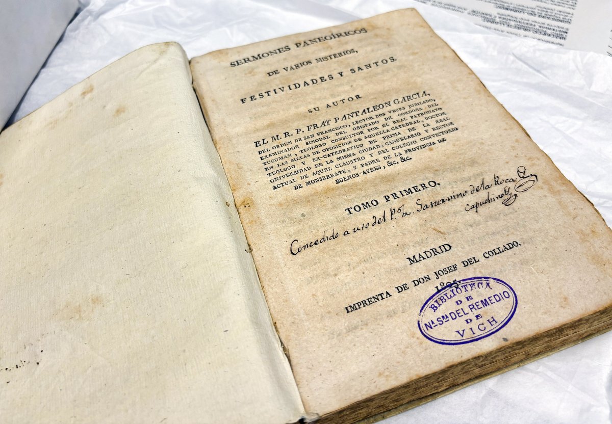 Sermones panegíricos de varios misterios, festividades y santos. Aquest és el títol d’un llibre de 1805 (volum 1) que la Unitat Central de Patrimoni Històric dels Mossos d’Esquadra va trobar-se en una pàgina web de subhastes. El llibre, tal com es pot veure a la imatge, tenia el segell de la biblioteca del convent de la nostra senyora del Remei de Vic, de l’orde dels franciscans.