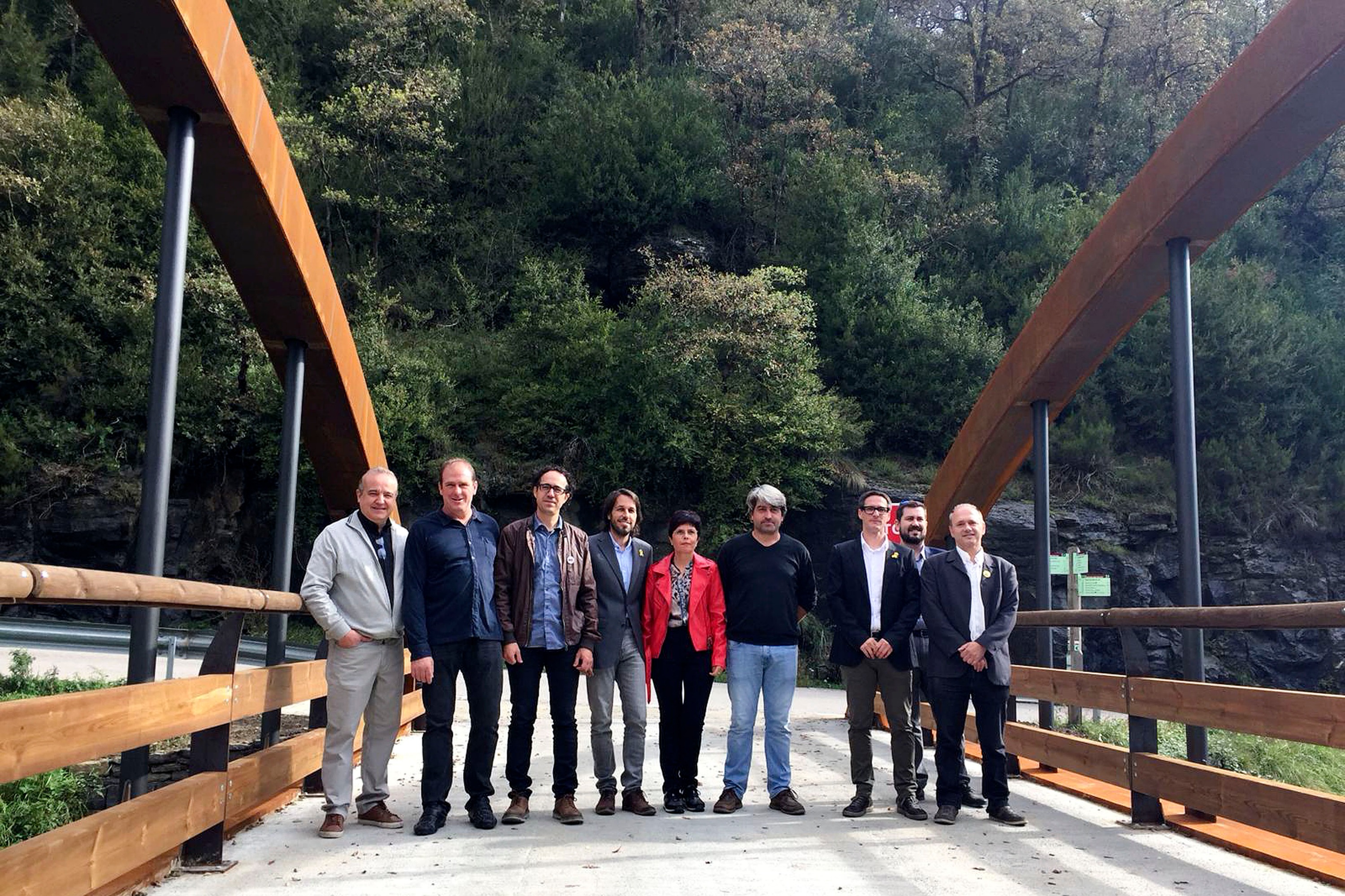 Ambient de festa grossa al poble. Era la sensació que es respirava dissabte al matí a la inauguració del pont dels Tres Ulls de Rupit. Una reivindicació històrica al municipi que s’ha dut a terme amb un pressupost de 207.000 euros. La nova estructura substitueix “un pont que no complia quant a seguretat i que va acabar sent un perill constant per a la ciutadania”, explicava dissabte Albert Marcé, alcalde de Rupit. La nova passarel·la, a banda de facilitar l’accés al municipi als veïns del Soler, tampoc posa en perill les cases del voltant en cas d’una crescuda de la riera de Rupit. “Abans els habitatges propers al pont sempre tenien aigua a casa i amb aquesta construcció el pont no es taponarà”, sostenia Marcé, ja que també s’han disposat defenses fluvials per reconduir el curs de l’aigua. A l’acte hi van assistir els diputats d’Infraestructures Viàries i Mobilitat i el d’Urbanisme i Habitatge de la Diputació de Barcelona, Jordi Fàbrega i Josep Ramon Mut, respectivament.