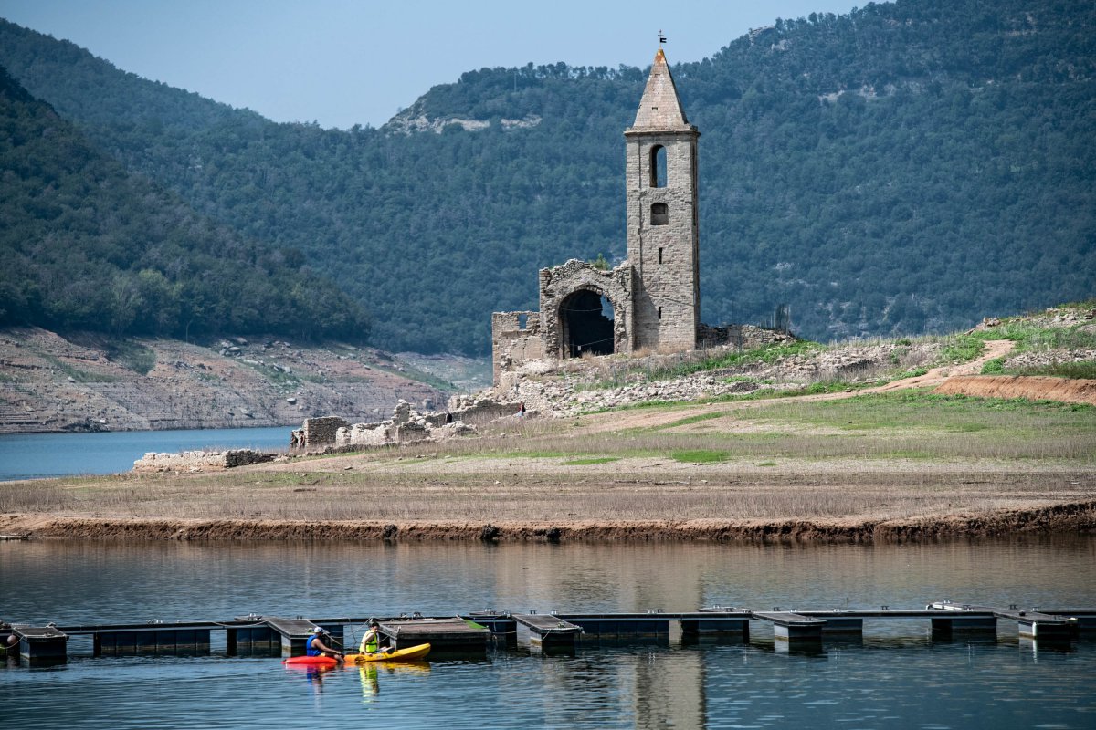 Aquesta era la imatge de l’embassament de Sau aquest dijous al migdia, amb tota l’església al descobert i accessible per terra. L’embassament estava al 21,4% de capacitat. A començament d’any, aquesta estampa, exponent, de la sequera va disparar visites. Les pluges de maig van arribar a situar l’embassament per sobre del 40% i el campanar tornava a estar mig cobert. Ara, de nou eixut, ja no sorprèn
