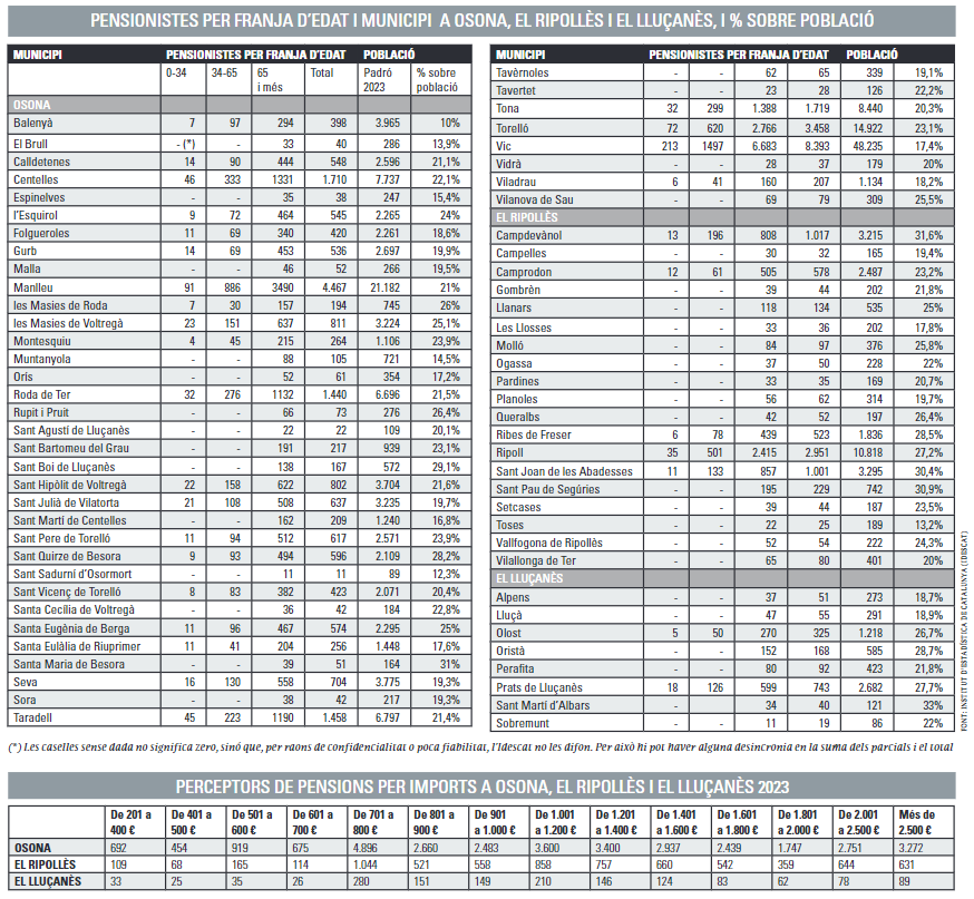 Segons aquest informe, i mantenint la tònica que ja fa anys que arrossega, el 2023 el Ripollès va repetir posició com a segona comarca catalana amb més proporció de pensionistes respecte a la població, només per darrere del Berguedà.