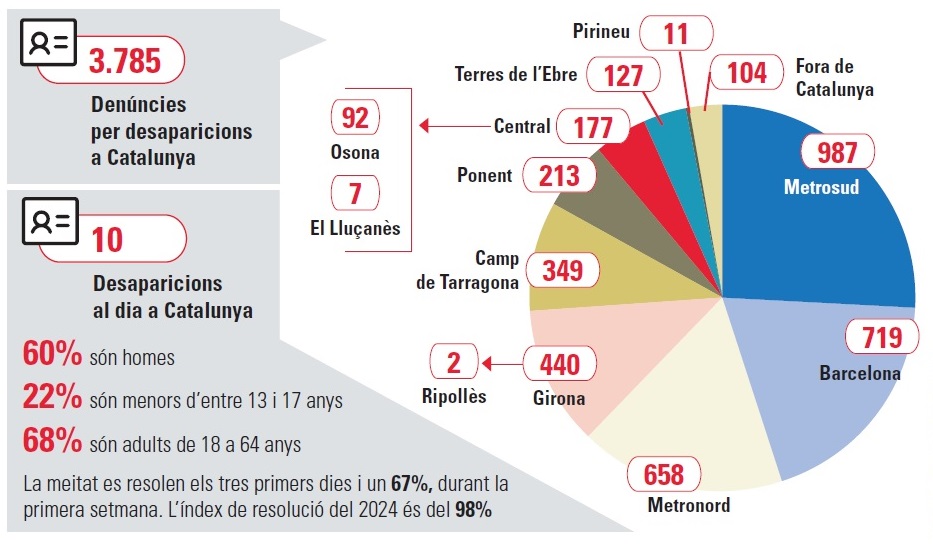 101 denúncies per desaparició. Aquesta és la xifra de casos que els Mossos d’Esquadra van instruir durant el 2024 a Osona, el Ripollès i el Lluçanès. Això representa una desaparició gairebé cada quatre dies en aquestes tres comarques.