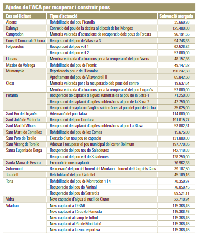 En total i comptant aquestes cinc subvencions de Viladrau, l’ACA ha donat un total de 182 ajudes valorades en més de 19 milions d’euros destinades a la recuperació i construcció de pous per tal d’incrementar la disponibilitat d’aigua dels ens locals i diversificar les fonts d’abastament.