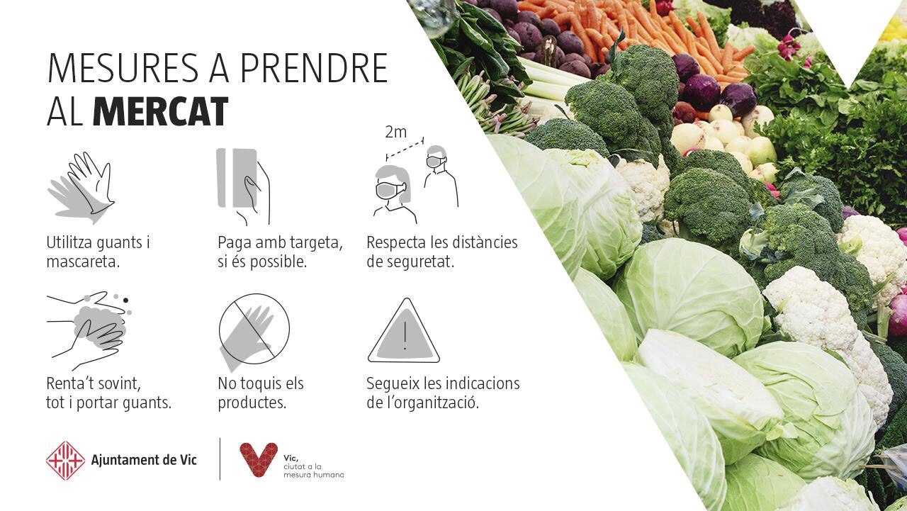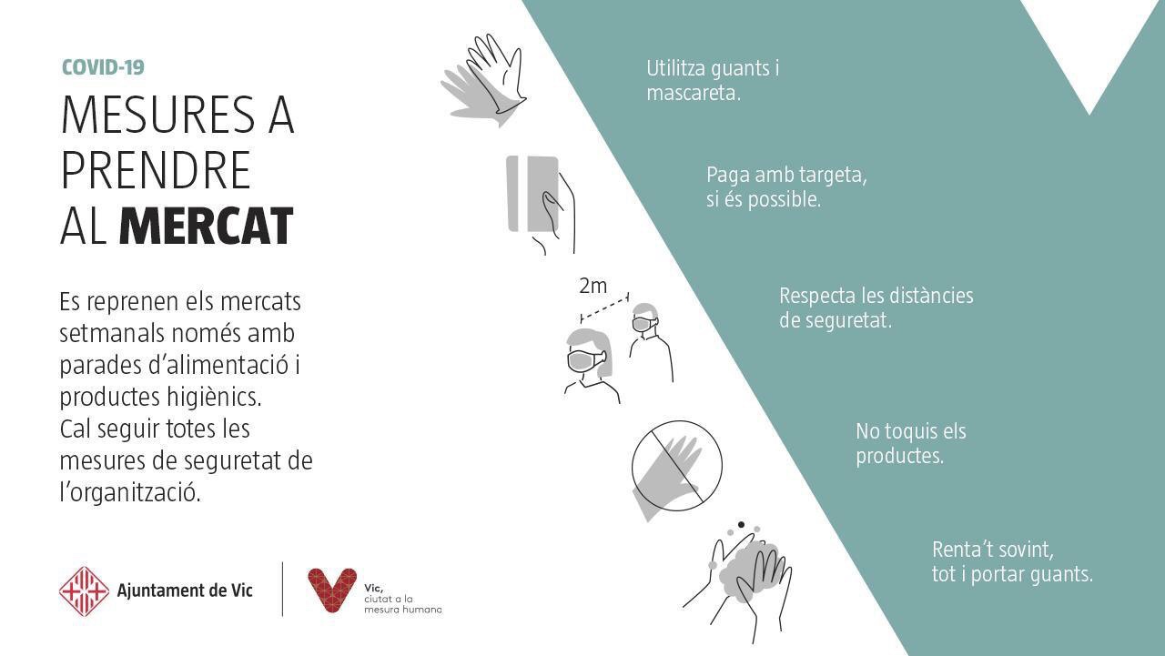 Des de la Regidoria de Promoció Econòmica, Ocupació i Comerç, que encapçala Bet Piella, es remarca que caldrà ser molt estricte amb les normes de seguretat i distanciament social, tant entre les parades que s’hi instal·laran com entre les persones que aniran a comprar al mercat. Entre les recomanacions de protecció hi ha el fet d’utilitzar màscares de protecció, guants i prioritzar el pagament amb targeta per evitar l’intercanvi de monedes.