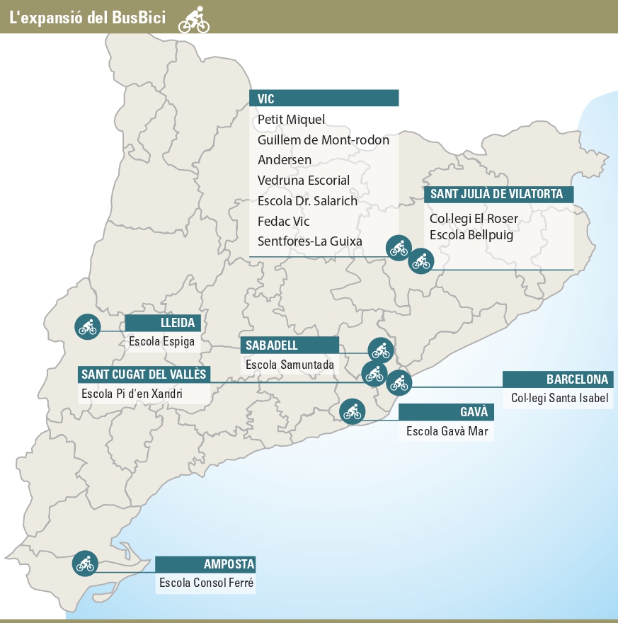 L’èxit del model Vic ha cridat l’atenció d’altres ciutats, “i des de Canvis en Cadena oferim xerrades per tot Catalunya on expliquem què és el BusBici i com s’ha d’engegar”, comenta Vilardell. Escoles de Sabadell, Lleida, Sant Cugat del Vallès, Gavà, Barcelona o Amposta ja han posat en marxa línies de BusBici, i d’altres poblacions com la Garriga, Igualada o Granollers tenen en ment fer-ho en breu.
