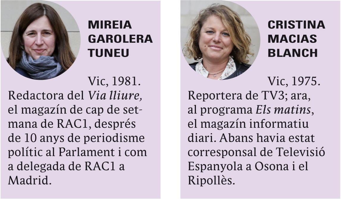 El periodisme és més una actitud que no pas una feina. Demana hores, molta entrega i, volgudament o no, sovint acaba sent sinònim de renúncia. S’exerceix d’ofici. Amb passió. I això ho saben molt bé Mireia Garolera, Cristina Macias, Núria Oriol i Esther Rovira, quatre dones que juntes abracen tots els mitjans de comunicació –la ràdio, la televisió i la premsa escrita– i que treballen en àmbits tan diversos com la informació política, de societat o els esports.