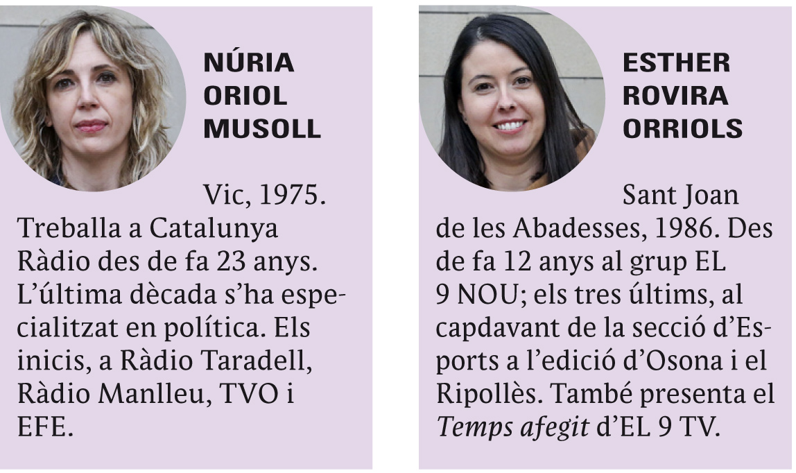 També és el pòsit d’anys i anys de societat patriarcal el que explica que en càrrecs directius hi continuïn predominant les corbates, o que en emissores de ràdio passin més hores en antena veus masculines que femenines. “En general som tot just al principi, prenent consciència, ens queda molt camí”. Així és com ho veu Núria Oriol, que treballa a Catalunya Ràdio des del 1998 i està convençuda que hauran de passar diverses generacions perquè la igualtat de gènere deixi de ser una quimera. Una part molt gran de la feina correspon a les mateixes dones. “La meva experiència tant personal com amb la resta de companyes és que tendim a arraulir-nos”, apunta Garolera. Aquesta afirmació genera consens entre les altres tres periodistes que ha convidat EL 9 NOU. Rovira ho ha viscut, per exemple, a l’hora d’incorporar veus femenines a tertúlies d’esports: “El primer pensament acostuma a ser que no ho farem bé, que no hi entenem, que no som qui per parlar…”. En el seu cas concret, a més a més, es mou en un entorn altament masculinitzat, des de caps de federacions fins a presidents de clubs o els regidors que habitualment assumeixen la cartera d’esports, i això també va calant en el substrat inconscient que atura les dones a l’hora de fer el pas.