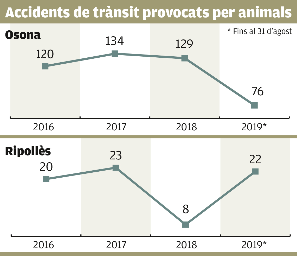 Per evitar-los “l’única solució que nosaltres veiem és la neteja dels vorals de les carreteres uns 150 metres”, segons Albert Alexandre, de la Societat de Caçadors El Congost. El cert és que els accidents provocats per animals no deixen d’anar en augment. Darrerament, es fan al voltant de 150 atestats anuals per aquesta causa a les carreteres d’Osona i el Ripollès. Són unes xifres que multipliquen per 15 els de 15 anys enrere. Els últims anys hi ha hagut a Osona al voltant de 130 accidents d’aquestes característiques i aquest any es va pel mateix camí. Fins al 31 d’agost se n’havien comptabilitzat 76, segons dades del Servei Català de Trànsit, si bé és en aquesta època de l’any, quan la nit s’allarga, que se’n produeixen més. Les xifres són més preocupants al Ripollès, que va camí de batre el seu rècord històric perquè amb vuit mesos ja en portaven 22, gairebé tants com tot el 2017 (23), després de la caiguda a només 8 de l’any passat.