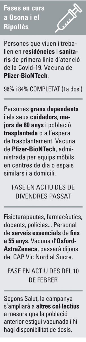 La convocatòria de famílies com la seva, amb persones molt grans o en situació de dependència, va a càrrec dels CAP, que parteixen d’una priorització d’usuaris determinada per Salut. Elvira Solà va ser de les últimes a vacunar-se dimarts a Ribes. El virus l’ha tocat de prop perquè, tot i que se’n va sortir, el seu marit va passar 15 dies a l’hospital: “Amb 75 anys, privar-te de tot, ni que sigui anar a fer un cafè, és acabar-te de matar. Em vacuno perquè l’únic que vull és que tot això s’acabi”. Ara el primer pas ja el té fet. D’aquí a 21 dies, mateixa hora, segona dosi, i un pas més a prop de tornar a tenir els nets a dinar.