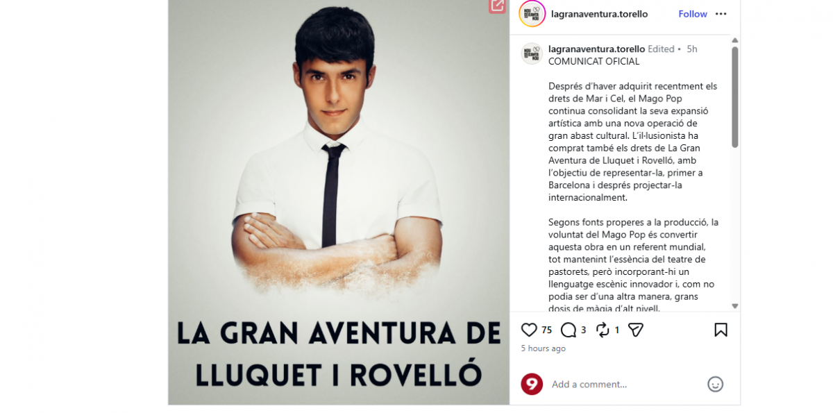 A Torelló ha saltat una altra notícia bomba. El Mago Pop, després d’haver aconseguit els drets de Mar i Cel, ha contingut la seva expansió fent-se amb els drets també de La Gran Aventura de Lloquet i Rovelló. L’objectiu del Mago Pop, segons explicaven des del compte d’instagram dels pastorets de Torelló, és portar la representació a Barcelona i convertir-la en un referent mundial. Això sí, tot mantenint l’essència del teatre de pastorets.