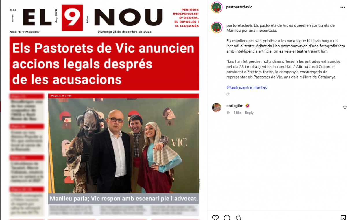 La resposta des de Vic no s’ha fet esperar i en una notícia com si fos la portada d’EL 9 NOU explicaven que la broma dels pastorets de Manlleu els hi havia fet perdre molts diners. Per aquest motiu posaven el cas en mans del conegut advocat Gonzalo Boye (a la fotografia amb personatges dels Pastorets de Vic).