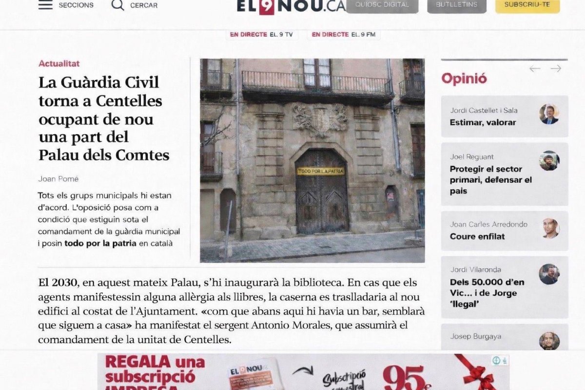 Una imatge de la web d’EL 9 NOU també servia per una innocentades a Centelles. Feien córrer aquesta notícia: “La Guàrdia Civil torna a Centelles ocupant de nou una part del Palau dels Comtes de Centelles”. Afegia que tots els grups municipals de Centelles hi estaven d’acord amb algunes condicions: que estiguin sota el comandament de la guàrdia municipal i que el rètol de ‘Todo por la patria’ estigui en català.