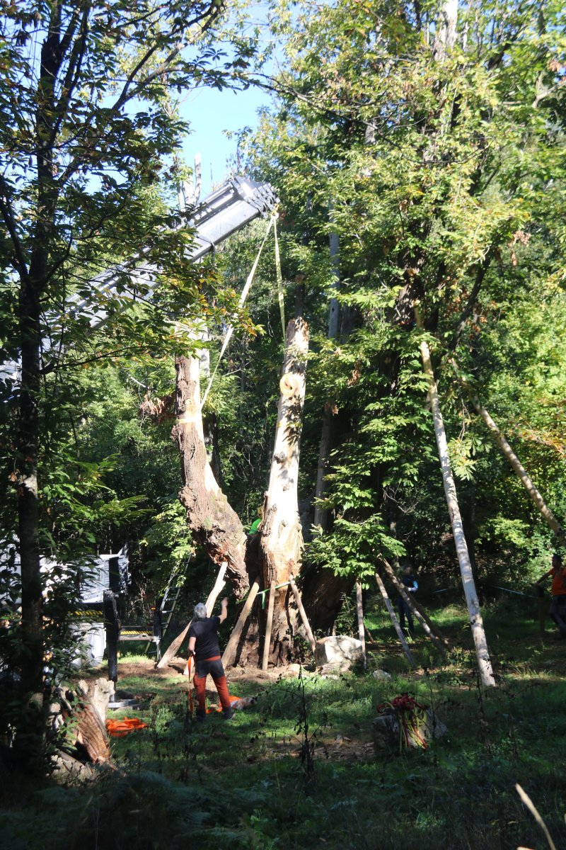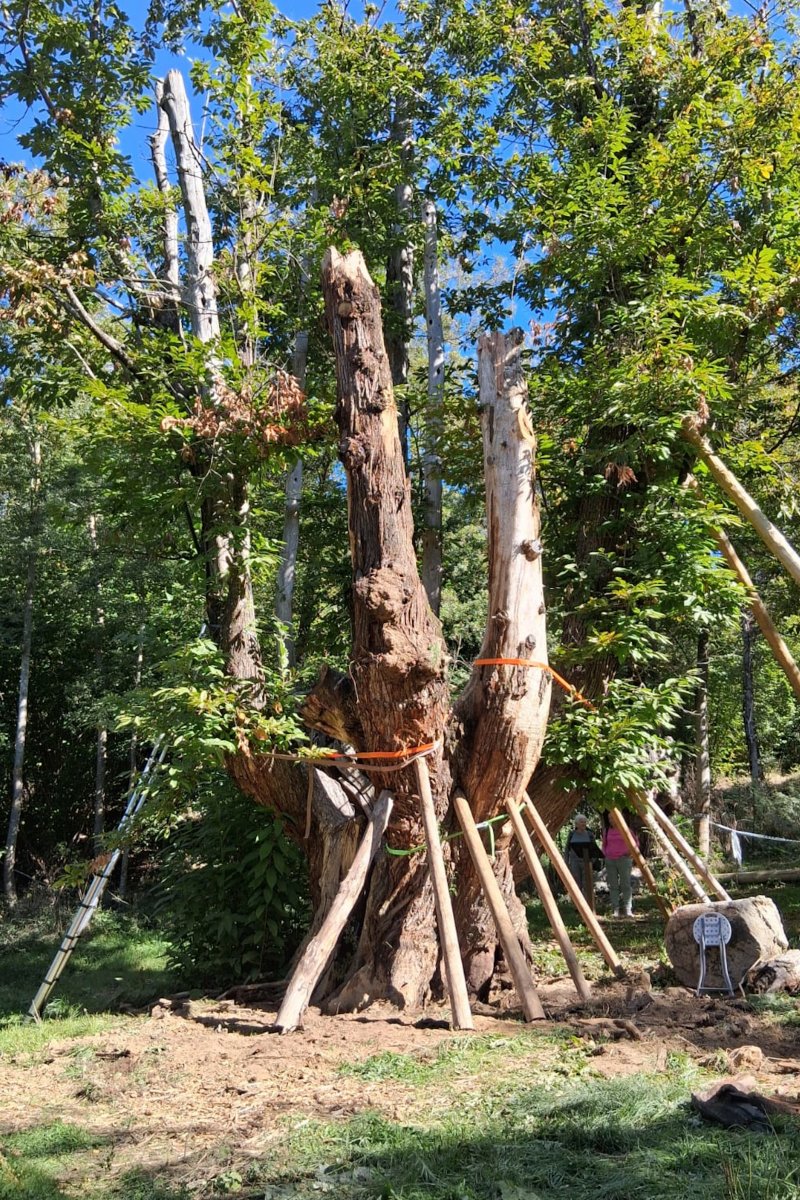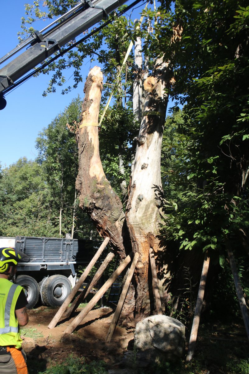 Lourdes Casademont/ Mar Martí | El Castanyer de les Nou Branques de Viladrau (Osona) ha recuperat l'”esplendor” i torna a tenir la branca gran que va caure el març del 2024 i que va generar una “gran preocupació” al ser un arbre emblemàtic de 700 anys. Tècnics de l’empresa pública Forestal Catalana estan fent els treballs de restauració. Amb l’ajuda d’una grua, s’ha enganxat la branca i es farà una mena de cosit a la soca per evitar que torni a caure. “Amb diferents actuacions volem intentar que l’arbre pugui viure 100, 200 o 300 anys més”, ha detallat un dels tècnics, Josep Maria Valls. Per a l’alcaldessa, Margarida Feliu, “és molt important que es torni a aixecar com a símbol i també pels rebrots que van sortint de l’arbre, que dona vida a tot l’ecosistema del voltant”.