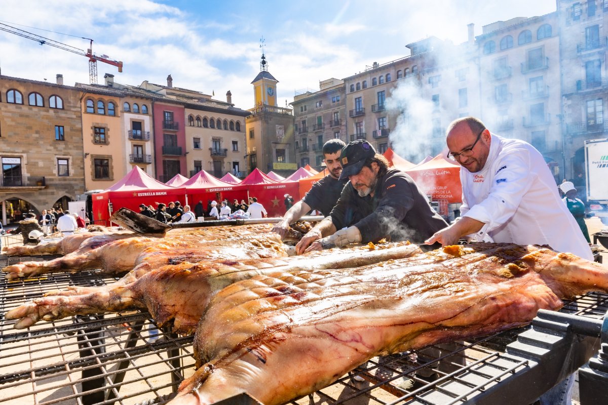 El procés d’engreix dels porcs Duroc és més lent, fet que els converteix, a efectes econòmics per al gran sector, en “menys eficients”. Per contra, es tracta d’una raça “molt agraïda” perquè ofereix uns resultats qualitatius “diferencials”. La seva carn és “més tendra, més sucosa i més gustosa”. Qui ho explica és Jordi Font, gerent de Provetsa, comercial farmacèutica de productes per a la veterinària amb seu a Vic i gairebé 40 anys de trajectòria. És l’empresa que aquest dijous va subministrar els sis porcs, més que mai, que des de la nit anterior van anar rostint al mig de la plaça Major –penjats d’unes flamants i espectaculars graelles– per servir-ne, al migdia i al vespre, un dels entrepans estrella del Dijous Llarder de Vic, el de porc rostit. La festa, ajornada una setmana pel decret de ventades de dijous passat, va tornar a congregar una gran gentada a la plaça Major.