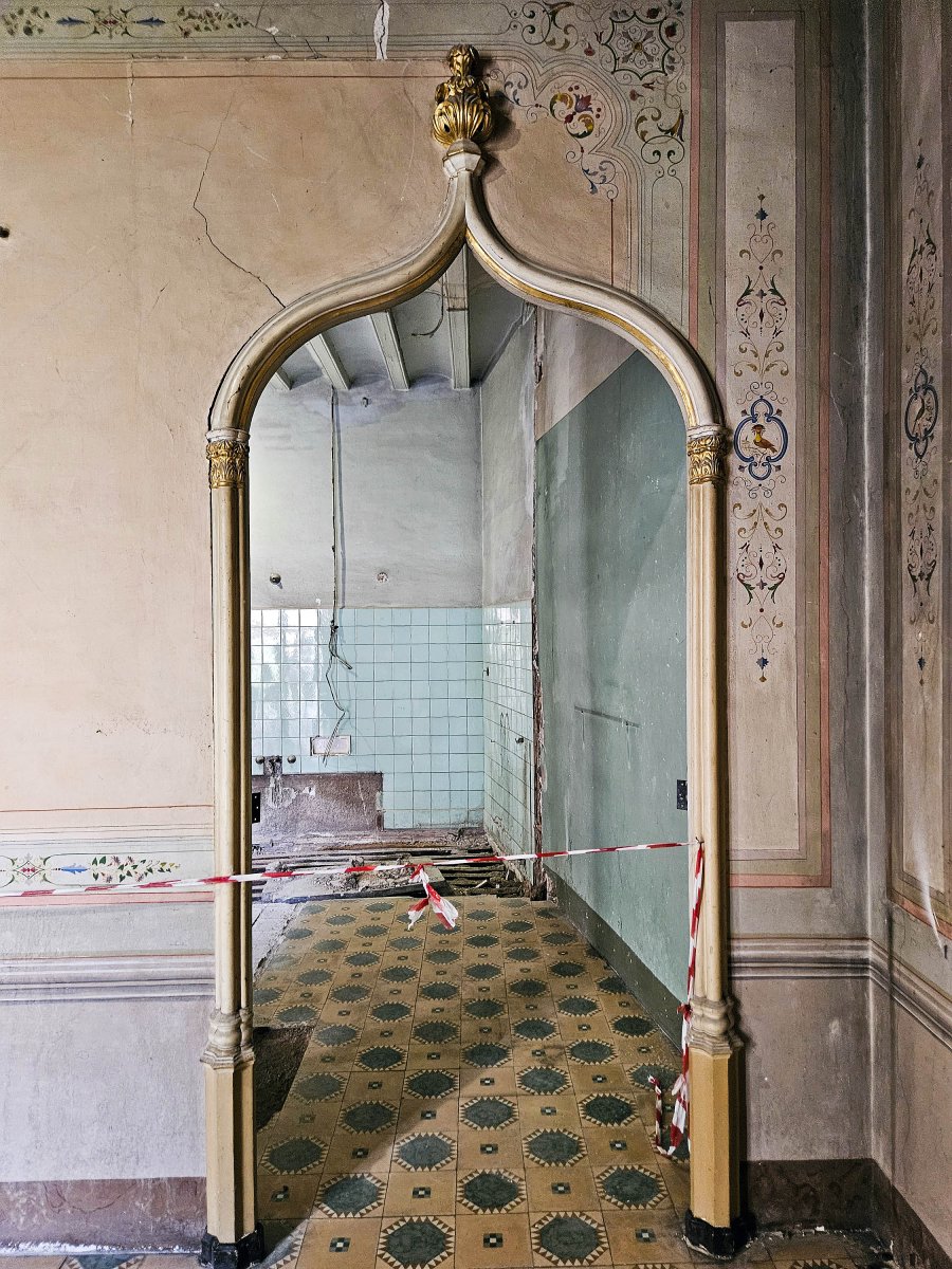 En estat de decadència des de feia temps, ara fa tres anys aquest immoble el va adquirir l’empresa Sinophos Group, una immobiliària gironina especialitzada en projectes singulars. Després d’una meticulosa tramitació, a finals de l’any passat van poder iniciar les obres de reforma. Tot i que el projecte s’ha proposat mantenir l’essència i els tresors patrimonials de la finca –condicionat també per la seva etiqueta de Bé Cultural d’Interès Local– poder-la visitar abans que es completi la seva transformació –en total hi apareixeran 12 moderns habitatges– resultava un atractiu afegit. A Cervera només li va caldre amanir-ho amb alguns dels seus relats amb ànima, on cada detall acostuma a tenir un perquè. El relat, de fet, arrencava amb una “mutilació”. La que va viure aquesta casa a principis dels 80, quan es va enderrocar tota l’ala dreta i, de passada, bona part de l’esplendorós jardí que acollia, per aixecar-hi un edifici plurifamiliar annex. Vist avui, una llàstima.