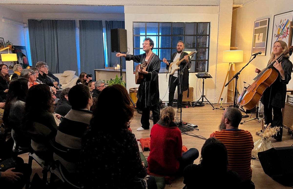 L’escenari escollit, un pis al Poble Nou que al llarg del cap de setmana acollirà quatre passis d’aquest concert-experiència. L’espectacle dissenyat per acomiadar ‘Postureo real’ ha comptat també amb moments molt poètics, dansa, i un recés per conversar i prendre un copa de vi abans de la traca final amb un repertori extens, amb el públic ja assegut a la cadira d’un gran però càlid menjador. Una experiència única i diferent que creix del treball conjunt amb la productora ‘La Otra Orilla’.