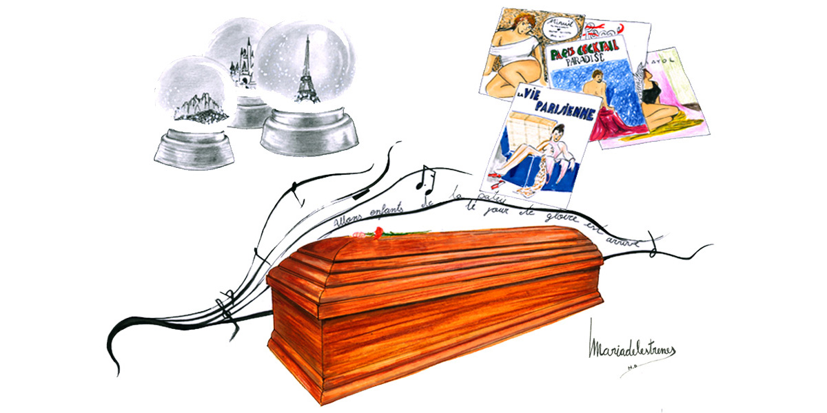 Quasi tres bancs sencers eren plens d’antigues alumnes. La difunta, de joveneta, havia estat exiliada amb els seus pares a França. El seu pare pertanyia al bàndol republicà. Varen ser només uns anys, però allà va aprendre a parlar perfectament el francès. A París, cada 14 de juliol, quedava commocionada per la celebració de la festa de França. Les desfilades i els focs artificials la impressionaven. Quan escoltava l’himne de la Marsellesa, amb la seva crida contra la tirania, els pèls se li posaven de punta. En retornar a Barcelona, en un pis de lloguer de l’Eixample, es va dedicar a fer classes d’aquell idioma a jovenetes que somiaven de tenir amors sota el cel de París. Les seves classes, sempre originals, començaven fent-los cantar: “Allons enfants de la Patrie. Le jour de gloire est arrivé!”. A continuació, agafava com a llibre de text la revista Paris Match, que trobava als quioscos de les Rambles. Un setmanari veraç i realista que informava de la societat i de la vida dels homes i les dones que protagonitzaven la vida política i artística del país veí.