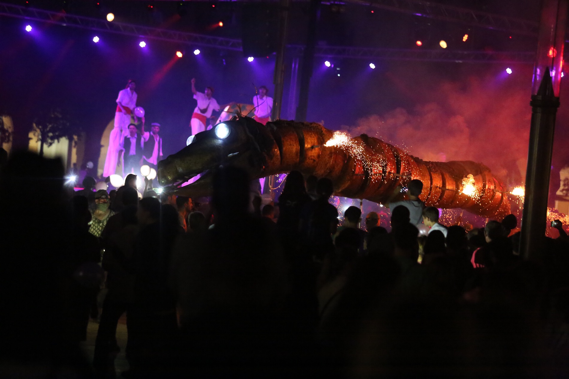 Puntual a la seva cita anual, el Serpent va aparèixer a la Devesa a les deu de la nit i, una vegada més, uns vailets li van prendre el diamant provocant la seva fúria. La gran bèstia va creuar el riu i va començar a perseguir els habitants de Manlleu. Una processó religiosa va intentar aturar el Serpent en més d’una ocasió però, primer al carrer Cavalleria i després a les Tres Creus, l’animal va atemorir el poble amb foc i pirotècnia. Just abans del desenllaç de la llegenda, la festa va voler fer una picada d’ullet a l’actualitat política del país i tots els capgrossos locals van sortir per diferents finestres de Can Puget decorades amb urnes en al·lusió al referèndum del proper 1 d’octubre.