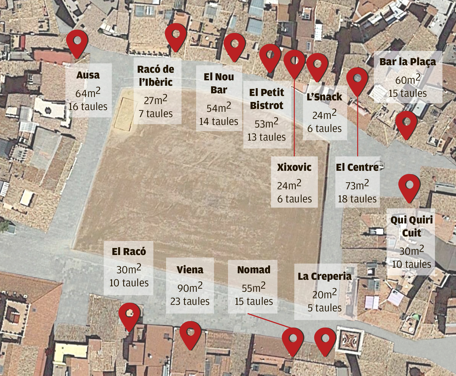 A dia d’avui, l’Ajuntament té autoritzades a Plaça un total de 158 taules, que permeten desplegar prop de 700 cadires. Corresponen als 13 establiments, entre bars, restaurants i una gelateria, que ho han sol·licitat. Entre totes les terrasses ocupen 600 metres quadrats.