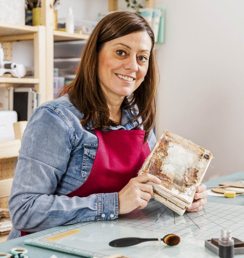 Raquel Alcaide, nascuda a Sabadell, viu al Moianès des de fa 10 anys. Està al capdavant d’un espai que tant és taller creatiu com botiga de manualitats i belles arts