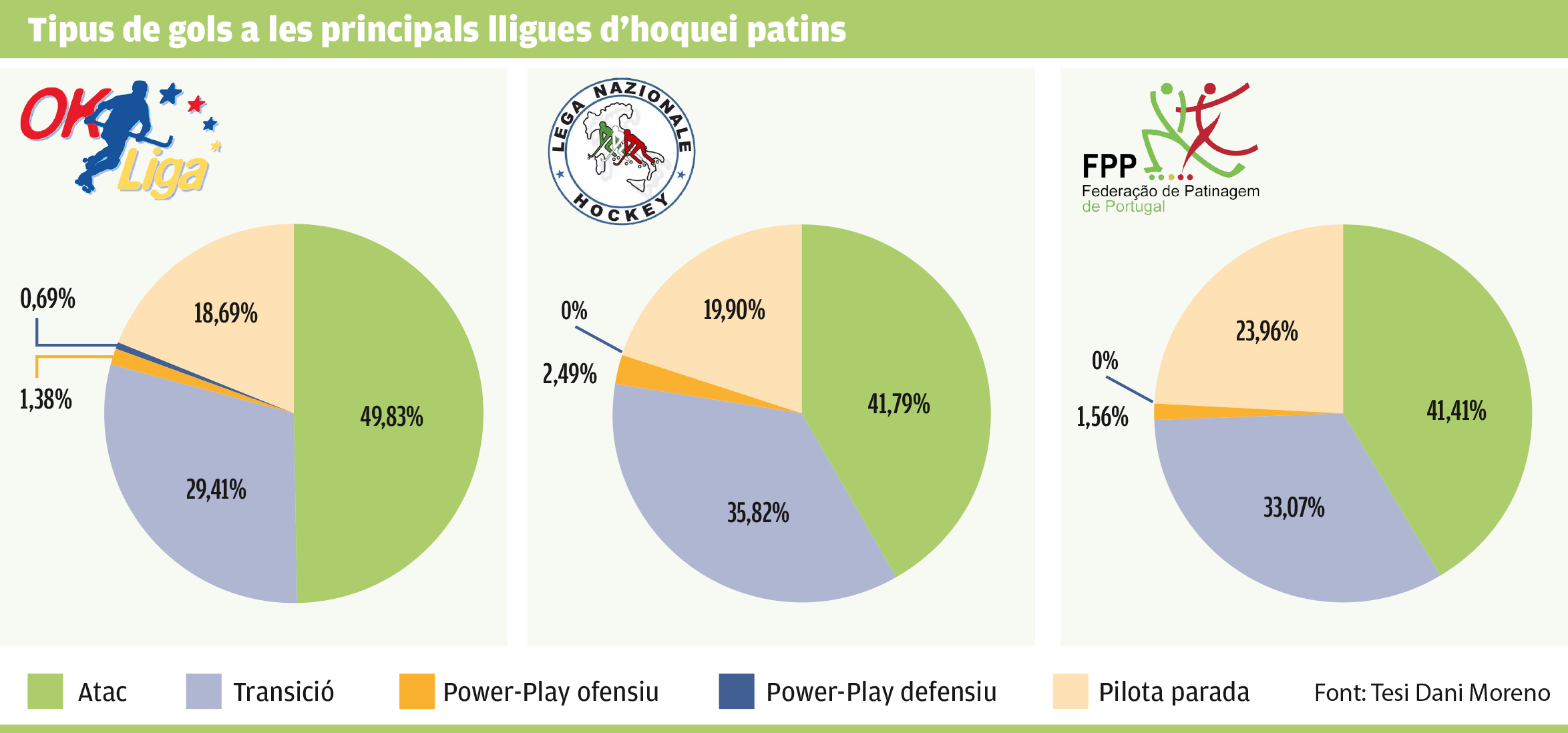 Graduat en Ciències de l’Activitat Física i l’Esport a la UVic-UCC i amb un màster en rendiment esportiu a l’INEFC Barcelona, Moreno, que vol fer docència universitària, tenia clar que analitzaria els clixés preexistents en el seu esport per veure si són certs i el treball li ha permès desmentir-los tots. Aquests eren que la majoria de gols venen en transicions, que la lliga amb més gols és la portuguesa i que no hi ha diferències en la finalització en les tres principals lligues d’aquest esport. Per confirmar o refutar aquestes idees va analitzar 50 partits de la lliga espanyola, 50 de la italiana i 50 de la portuguesa, que van sumar un total de 1.074 gols. Moreno es va fixar en quina fase venien aquests gols, quina acció tècnica s’utilitzava per marcar-los, amb quina acció tècnica es feia l’assistència, des de quina zona es feia l’assistència i si hi havia superioritat numèrica. Les dades mostren que en gran mesura els gols es marquen en jugades d’atac a les tres lligues (vegeu quadre), que la lliga amb més gols és la italiana i que sí que hi ha diferències en la finalització. Si bé en les tres competicions les accions més usades són la rematada, el tir de pala i el tir de cullera, la quarta canvia. A l’OK Lliga és aixecar i picar, a Itàlia és driblar de pala i cullera perquè hi ha més espais i a Portugal és la punxada.