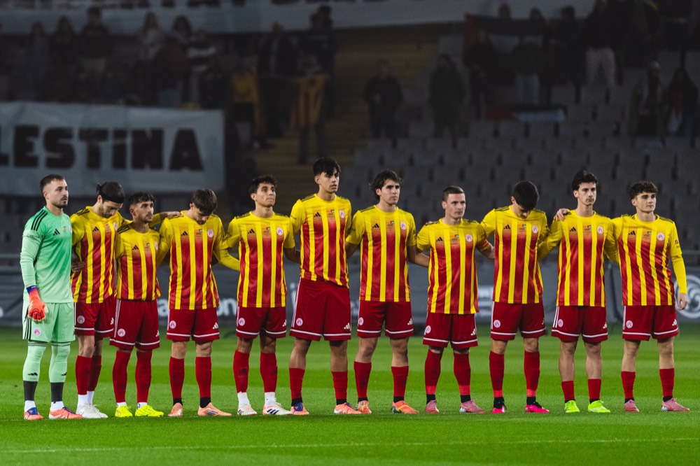 El porter vigatà del Vila-real, Arnau Tenas, va defensar la porteria del conjunt català durant els noranta minuts, mentre que, Albert Orriols Urri, també de Vic, va ingressar a la represa en el que va ser la seva primera vegada vestint la samarreta groc-i-vermella. Per la seva banda, el camprodoní Joel Roca va jugar la primera meitat. I, de fet, l’extrem del Girona va forçar el gol en pròpia de Palestina, que suposava el 2 a 0 per a Catalunya.