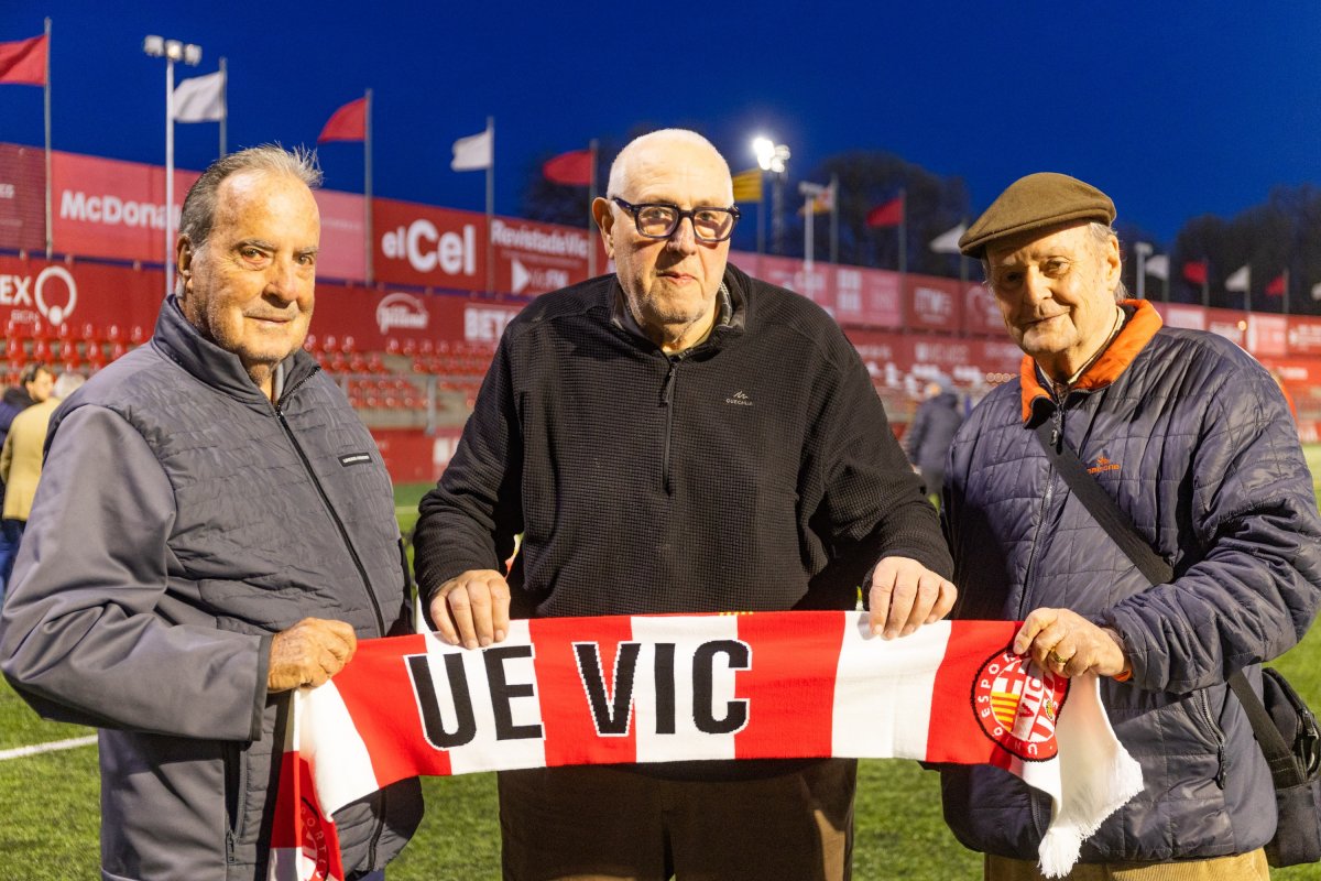 Són, d’esquerra a dreta, Jacint Codina, Joan Orriols i Josep Bover. El primer, l’empresari que des de la junta directiva de la UE Vic va liderar el repte de tirar endavant el nou estadi de futbol. El segon, el regidor d’Esports de l’Ajuntament que va començar a moure el projecte –que continuaria després amb el seu successor, Joan Brugués–. I el tercer, el taxador oficial que va posar preu als terrenys per poder activar la subhasta. I ara, pare d’un membre de junta i avi de dos jugadors.