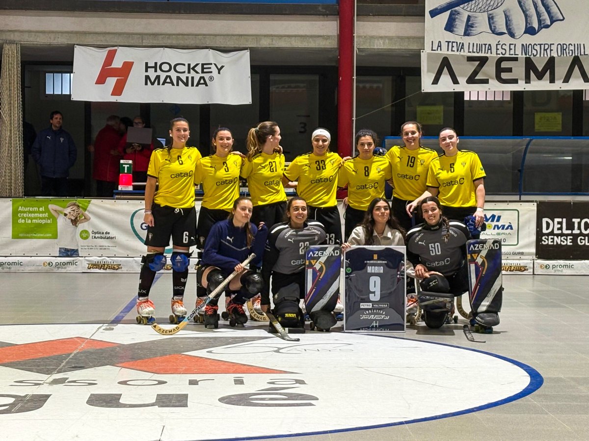 Sant Hipòlit de Voltregà va viure un doble homenatge a Maria Anglada. La jugadora, que va penjar els patins el mes de desembre, va ser homenatjada per les seves excompanyes d’equip al final del partit entre el Voltregà i Las Rozas. Les jugadores li van fer entrega d’una samarreta amb el seu dorsal, el 9 (a la foto).