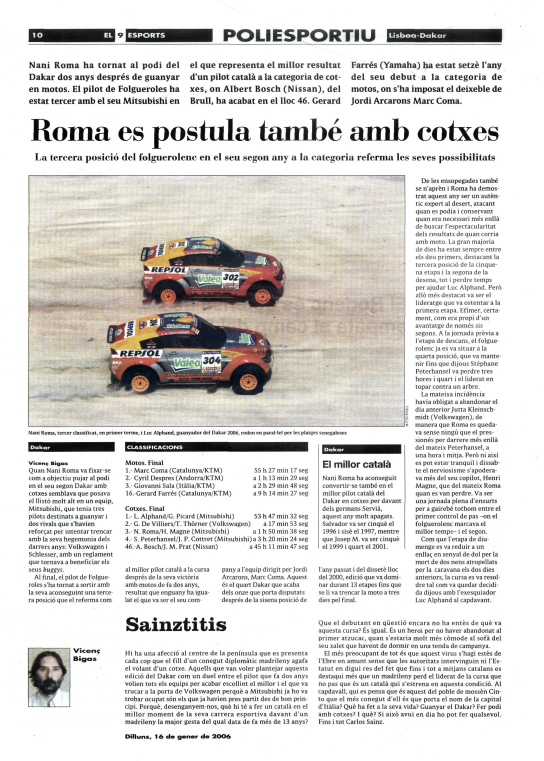 Al final, el pilot de Folgueroles s’ha tornat a sortir amb la seva aconseguint una tercera posició que el referma com al millor pilot català a la cursa després de la seva victòria en motos de 2005 i del dissetè lloc del 2000, edició que va dominar durant 13 etapes fins que se li va trencar la moto a tres dies pel final.
